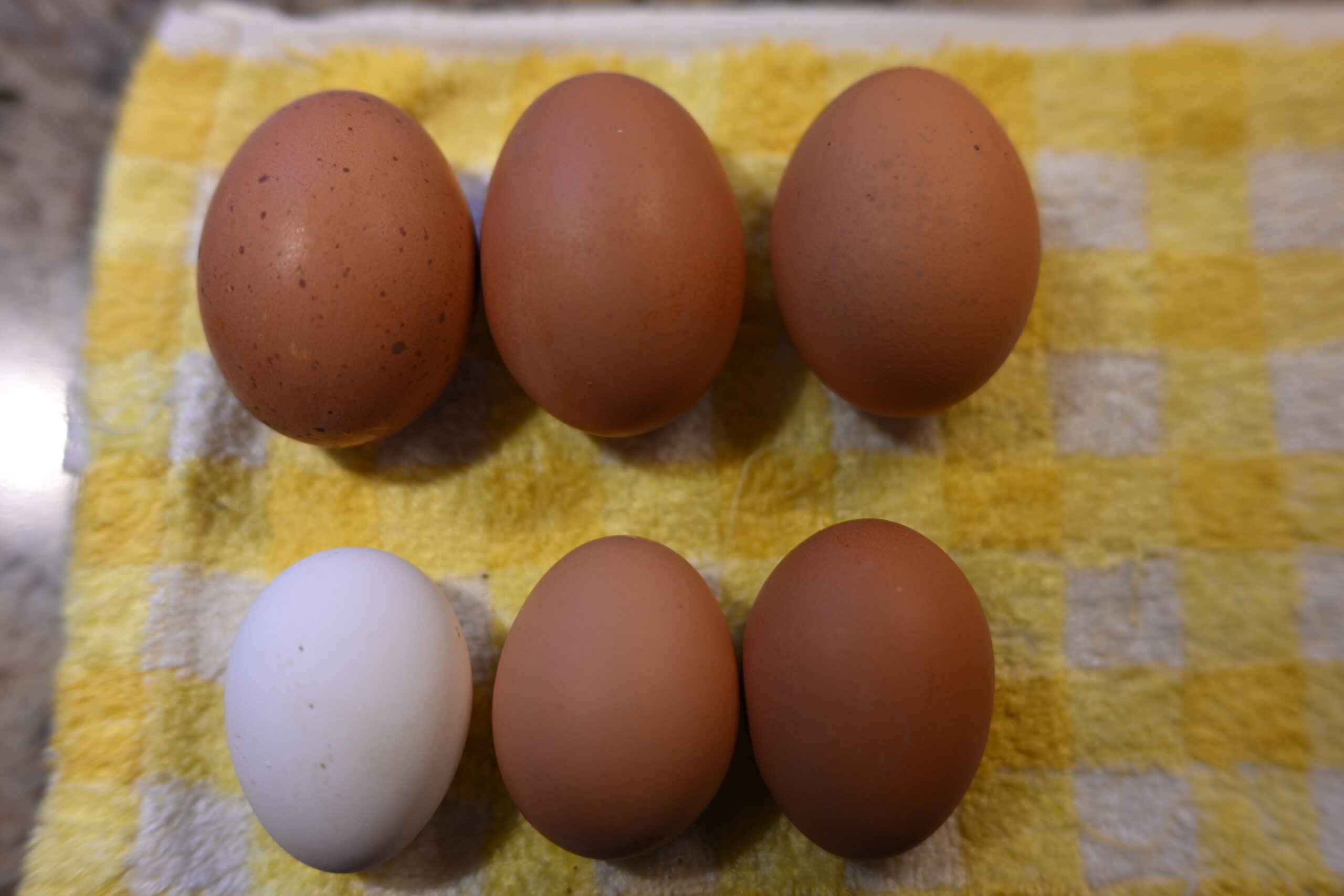 Nest run The eggs we get from our CSA are “nest run” — not graded for size. The carton I opened today had a particularly large variation, with 3 eggs over 70 grams and 3 around 40.