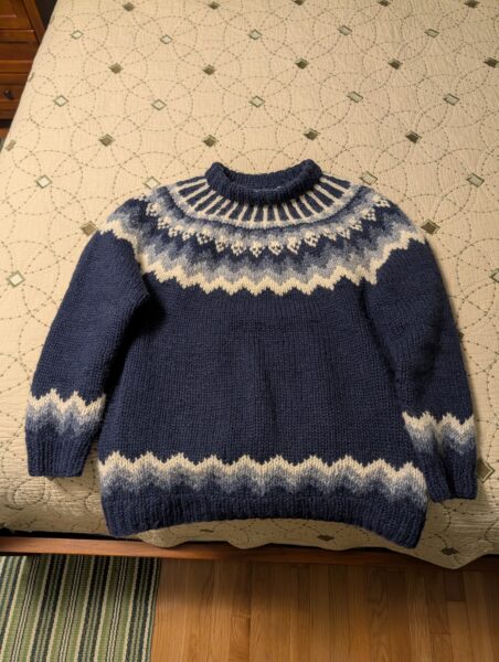 This is the authentic hand-knit traditional Icelandic sweater that I bought on our trip last winter. It cost a pretty penny and I joke that they use one entire Icelandic sheep’s wool in each sweater. It is VERY WARM and is my favorite item of clothing for my commutes into Boston this week.