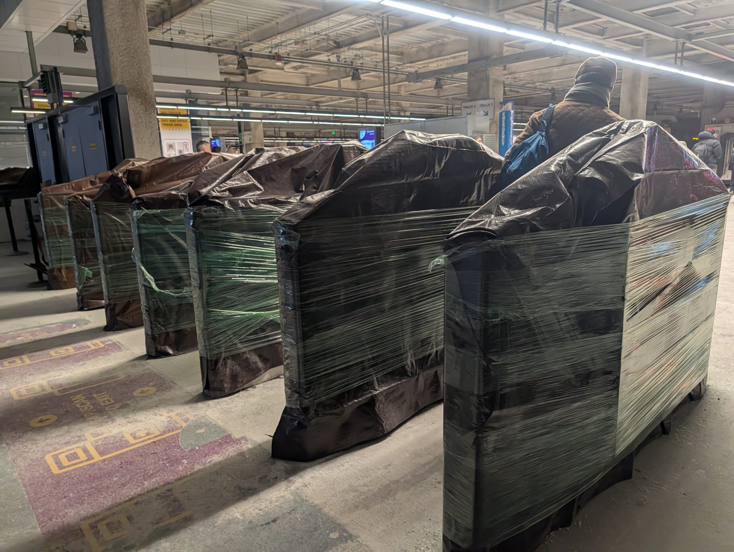 That didn’t take long The fancy new fare-enforcement turnstiles at South Station are wrapped up like arborvitae, waiting for warmer weather or better software or something.