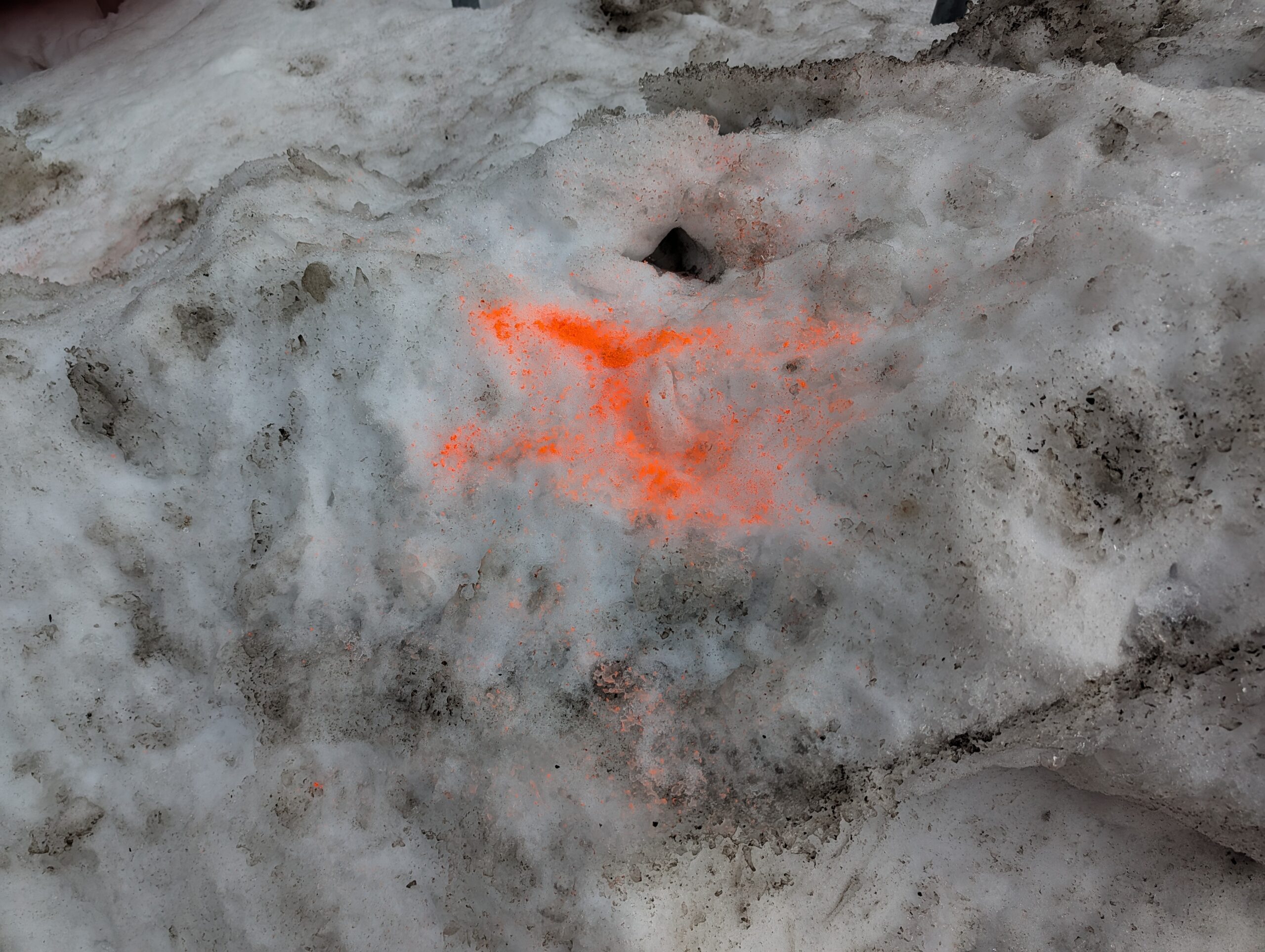Permanent now This snowbank has been here (Boston, on my walk from office to train) for long enough to get marked up by DigSafe.
