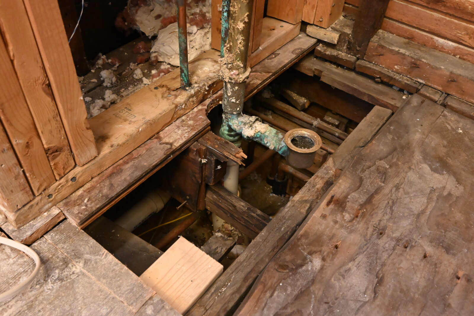 Our contractor intended to do a quick swap of the old tub for the new one today. But the previous re-muddle left such a mess he’s going to have to rebuild more before putting it back together. The worst is that what remains of this floor joist would be what’s supporting a tub full of water.