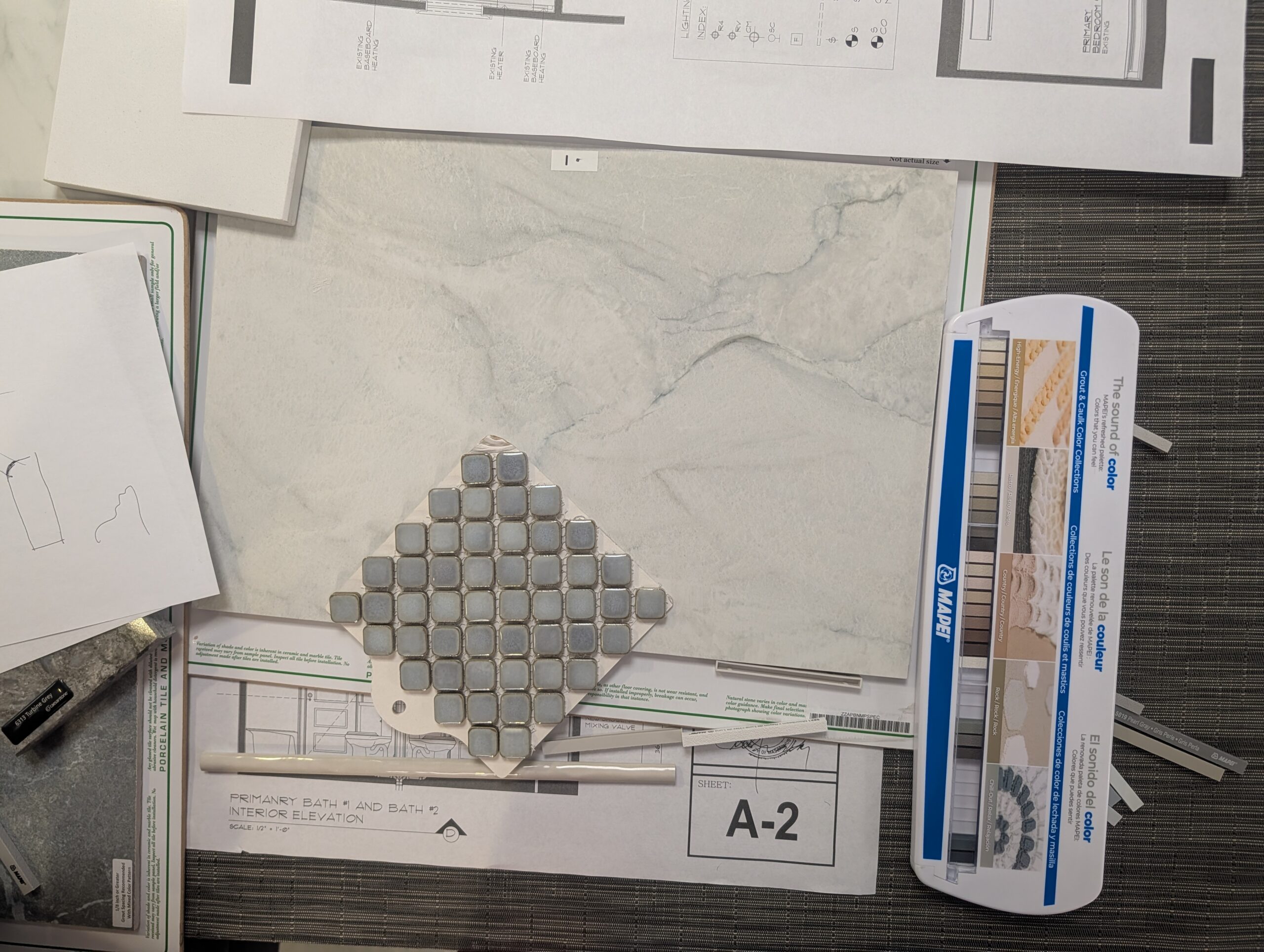 Some of our tile choices for the two bathrooms.