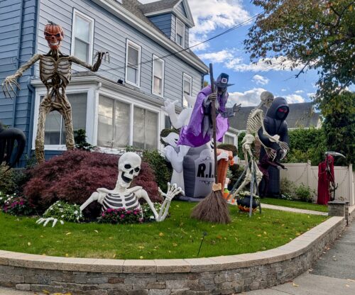 a lot to see here There’s a lot of stuff going on at this house; the giant skeleton coming out of the ground is pretty great, as is the creepy floating witch. And the red-robed Grim Reaper at the end is far scarier than his inflatable cousin up the street.