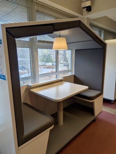 study spot My library has built these neat little cubbies where a person can study with someone else. Perfect if you’re just studying together, or working on a project quietly if there’s no study rooms available.