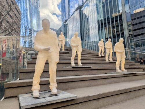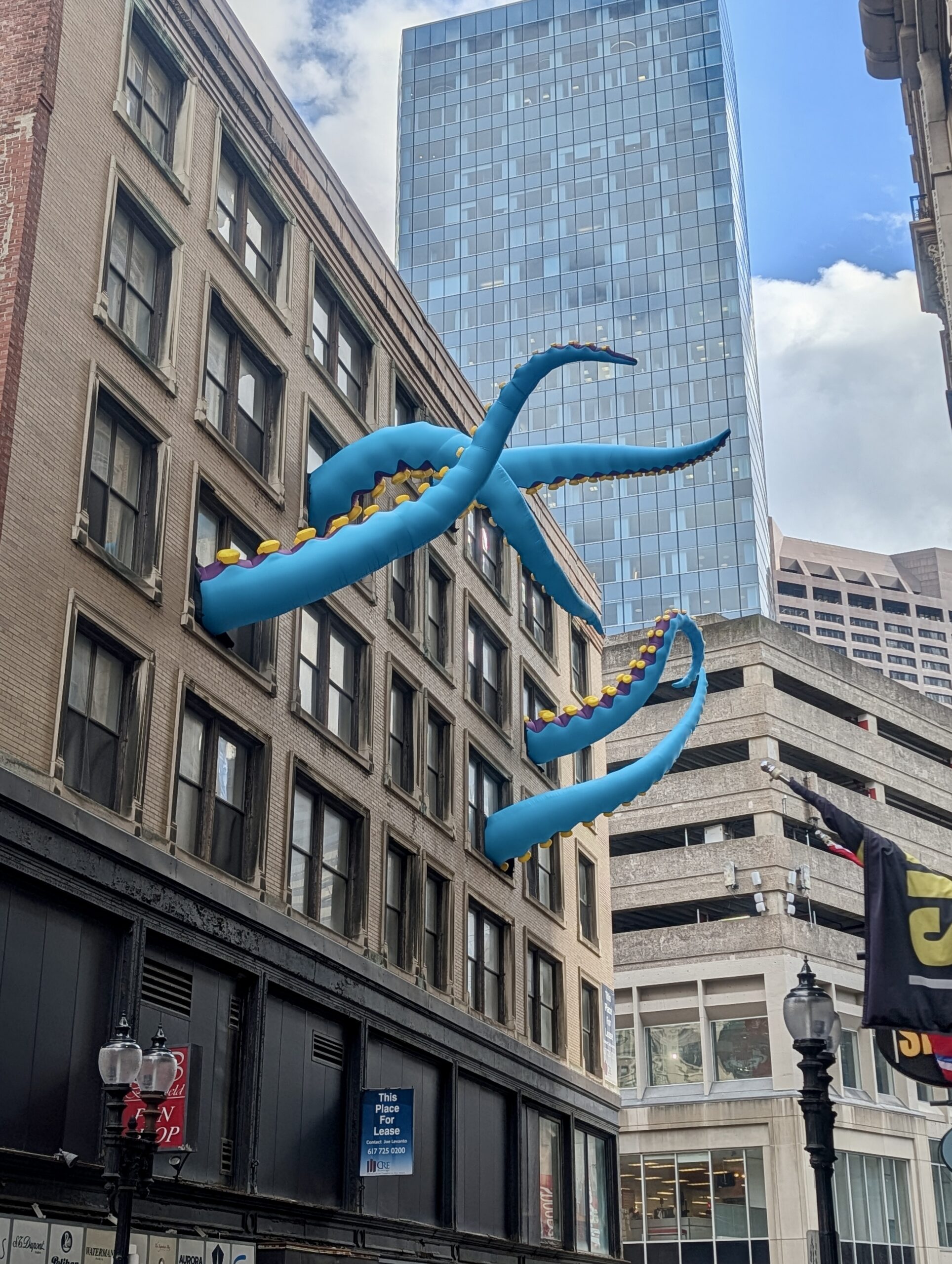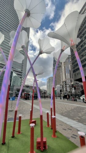 I had an appointment in Boston this afternoon, and with the way the train schedule works, I arrived quite early and had some time. There’s an interactive art exhibit around the city, so I wandered around looking for the various exhibits. The tall flowers were fun–you press buttons and they light up and play music. But I really got a giggle from the Kraken in the office building.
