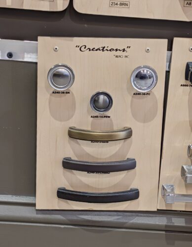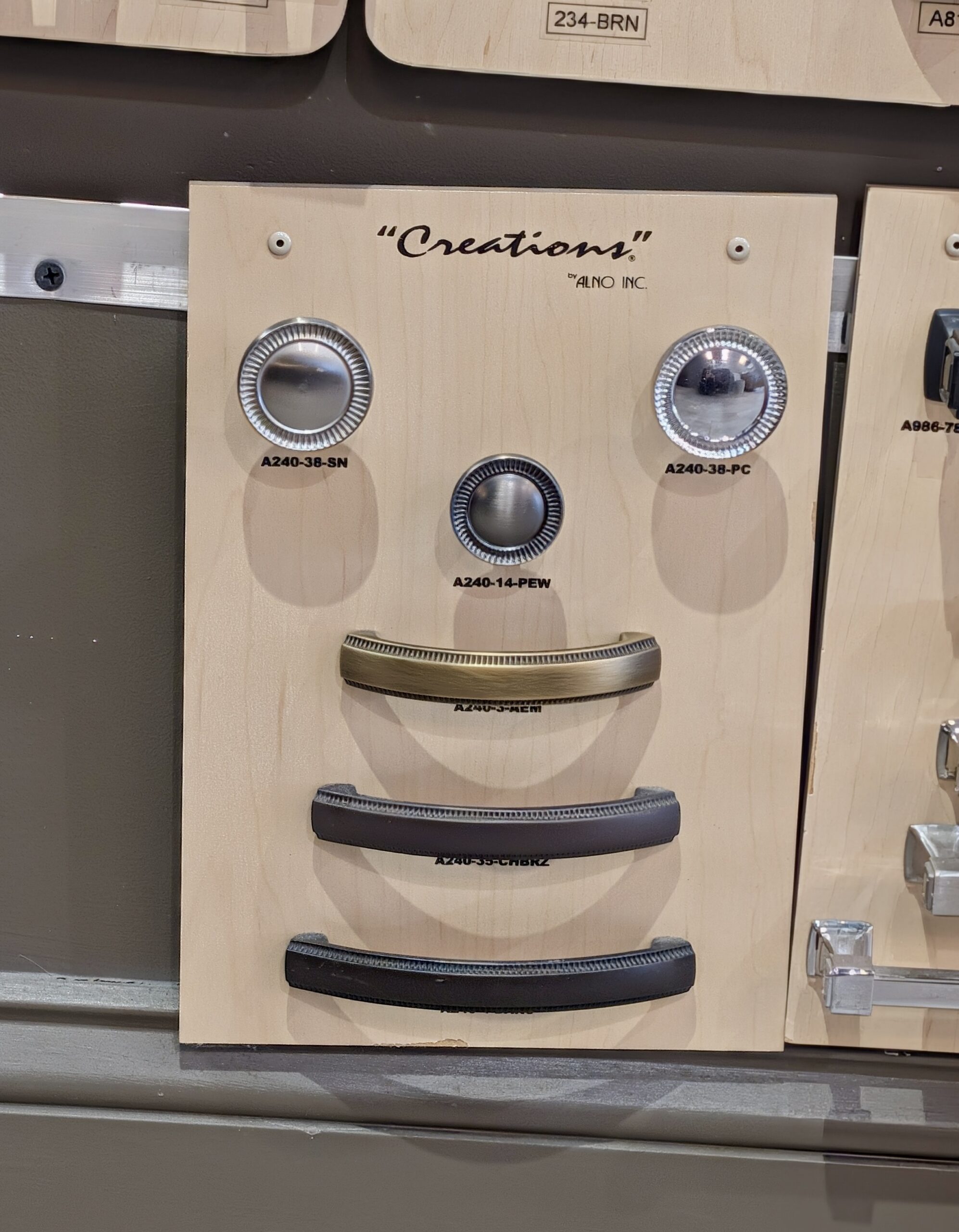 happy fixtures Doug and I went poking around a couple kitchen/bath showrooms, shopping for ideas for the bathrooms we are finally getting redone. Doug spotted this display, looking like a smiley face, and I really hope it was intentional.