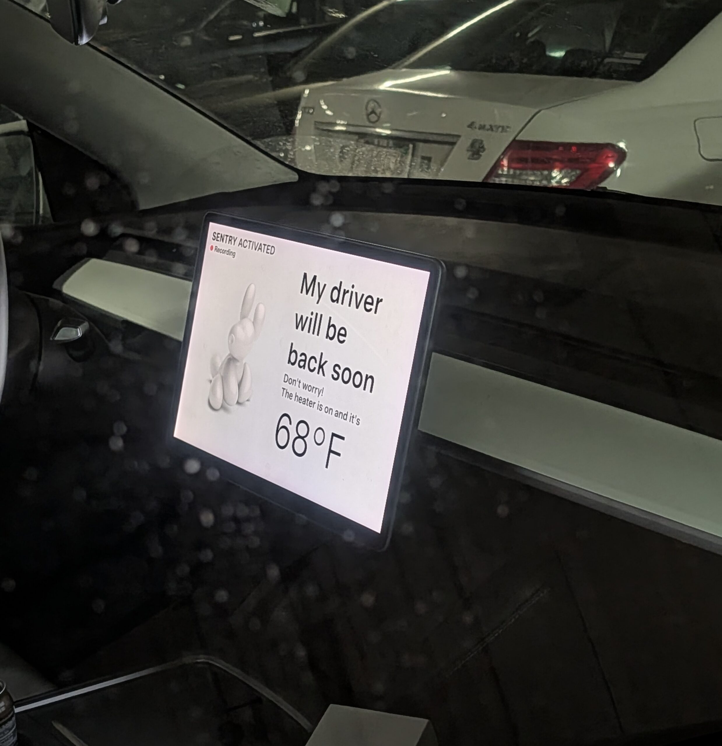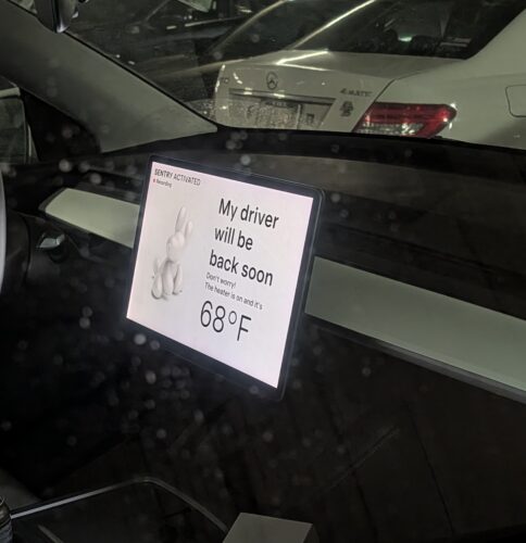the dogs are OK Saw a couple golden retrievers in the backseat of this car. Whatever you may think of Tesla, you have to admit having this setting in the car is a pretty great idea.