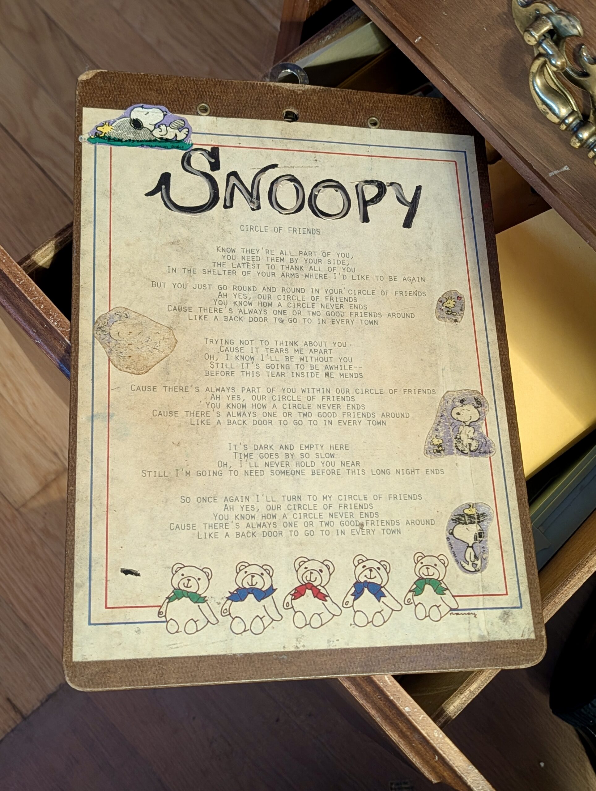 While the bathrooms are being renovated, Doug and I are going to relocate to the guest room, since our bedroom will be covered in tarps as a staging area.  The guest room desk has small drawers that may be useful for socks, meds, other small things.  In cleaning it out, I came across one of my old camp clipboards.  A Camp Runels counselor would never be found without her clipboard!