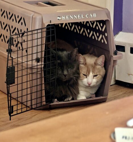 Doug, the kitties, and I have successfully moved into Kat and Bob’s house for the week while the bathrooms are being demo’ed.   The cats arrived in separate carriers, but have crammed together into one and they seem to be taking comfort in one another for now.