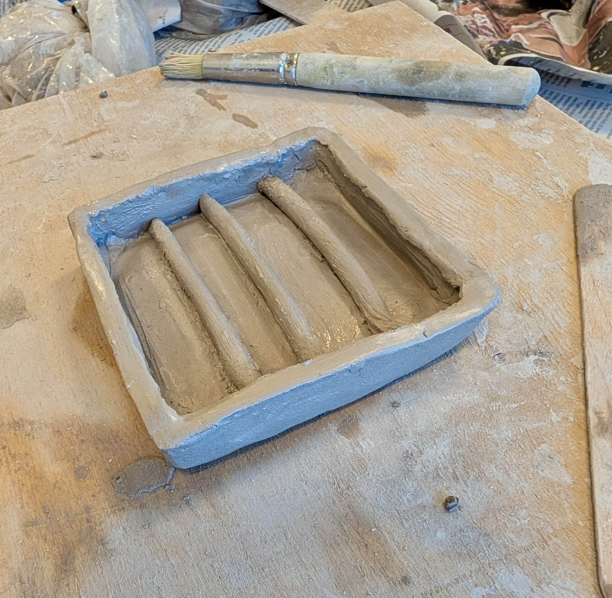 first effort I am taking an “Introduction to Clay” class. Doug and I were discussing what sort of things I could make, and of course when I arrived today, I could only think of one. So….here it is. A soap dish for one of the new bathroom.
