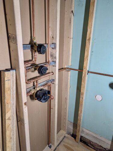 visible progress Up to this point, it’s been a lot of demo and general destruction and banging holes into the wall and floor. Today, we actually saw some forward progress–our shower! Isn’t it lovely?