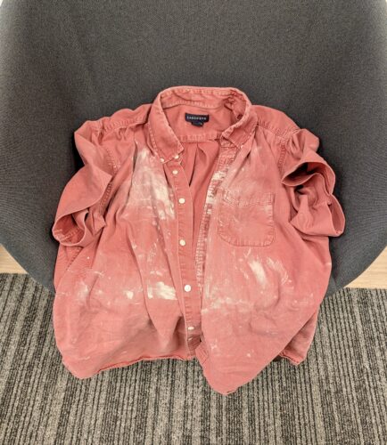 I’ve used this old shirt of Doug’s when painting stuff, and as you can see, it has already worked well to keep clay off my clothes. I did have to shorten the sleeves to make it usable for me.