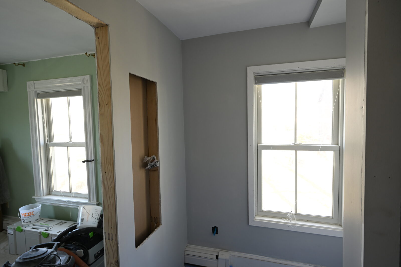 Two window posts in a row! Such is progress in these things. This window in the Green Bathroom is moving to the right, but is delayed: the building inspector is requiring tempered glass so it had to be reordered. But we need to make progress. So the opening is rough framed to allow drywall to proceed. And the outside is being left alone for now because we’re having Second March here in April and it’s cold out.