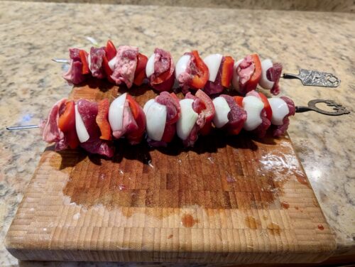 Peppers and onions from the farmers market, and meat from our CSA make for very tasty kabobs.
