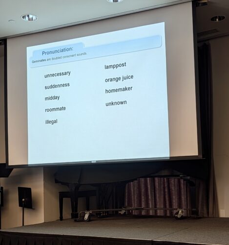 Went to an ELL teacher workshop today. It was, essentially, about why English is so difficult to learn with all the weird spelling and pronunciation rules.  Here was one thing I’d never heard before: geminates.  Basically, you’re repeating the same consonant, not specifically the letter. I love stuff like this.  Try saying these words aloud.